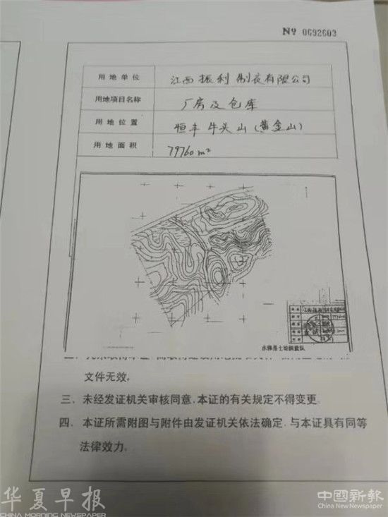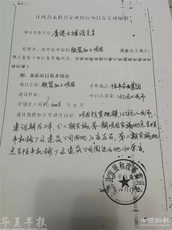 近日,记者接到香港企业家王雄浩先生的投诉说,他2006年在江西省九江市永修县恒丰企业集团投资服装项目,购置的200亩土地款一次性付清给了永修县国土局,直到今天,已经13年过去了,恒丰企业集团仍然还没有将合同规定的130亩土地划到位。导致计划好的服装项目无法启动,只能在70亩到位的土地上,开了一家小服装厂,只能小打小闹,无法扩大产能。