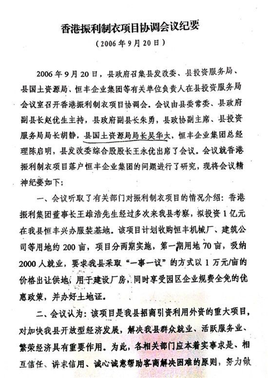 据了解,2006年,王雄浩经多次考察论证,决定在恒丰企业集团所在地兴办服装加工企业。当时,王雄浩先生是招商对象,受到了永修县的热忱欢迎并保证为王雄浩先生投资提供优惠政策和优质服务。一份《香港振利制衣项目协调会纪要》文件记载:2006年9月20日, 永修县人民政府召集县发改委、县投资服务局、县国土资源局、恒丰企业集团等有关单位负责人在县投资服务局会议室召开香港振利制衣项目协调会,会议由时任县委常委、县政府副县长赵优生主持,时任县政府副县长朱勇, 时任县政协副主席、时任县投资服务局局长胡静, 时任县国土资源局局长吴华太,恒丰企业集团总经理陈启明, 时任县发改委综合股股长王永优出席了会议。会议就香港振利制衣项目落户恒丰企业集团的问题进行了研究。