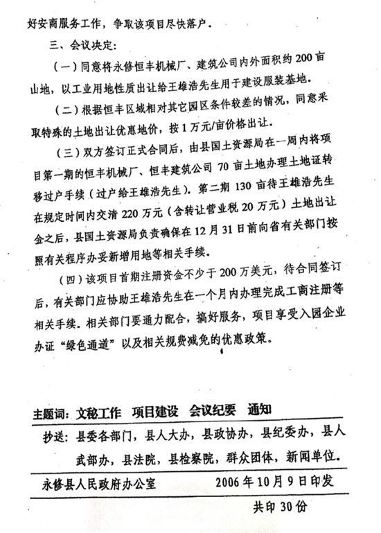 会议决定:同意将永修恒丰机械厂、建筑公司内外面积约200亩山地,以工业用地性质出让给王雄浩先生用于建设服装基地。根据恒丰区域相对其它园区条件较差的情况,同意采取特殊的土地出让优惠地价,按1万元/亩价格出让。双方签订正式合同后,由县国土资源局在一周内将项目第一期的恒丰机械厂、恒丰建筑公司70亩土地办理土地证转移过户手续(过户给王雄浩先生)。第二期130亩待王雄浩先生在规定时间内交清220万元(含转让营业税20万元)土地出让金之后,县国土资源局负责确保在12月31日前向省有关部门按照有关程序办妥新增用地等相关手续。该项目首期注册资金不少于200万美元,待合同签订后,有关部门应协助王雄浩先生在一个月内办理完成工商注册等相关手续。相关部门要通力配合,搞好服务,项目享受入园企业办证“绿色通道”以及相关规费减免的优惠政策。