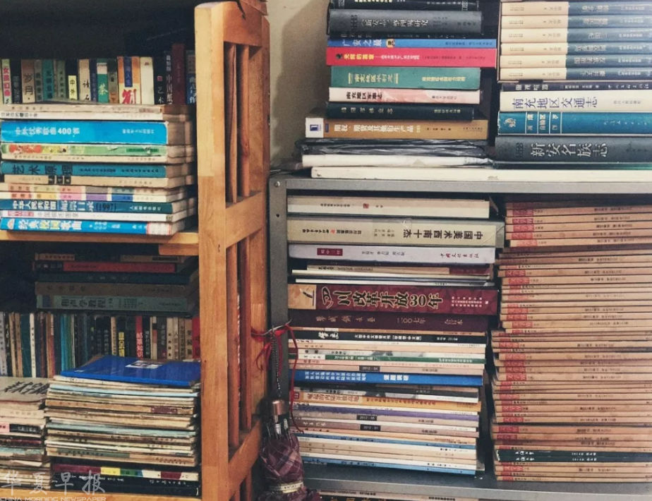 王忠明在成都的店铺中收藏了五万册书,在书店楼下的仓库中也有一部分藏书,在绵阳老家有一万多册书,现在他的私人藏书已经有近七万册。