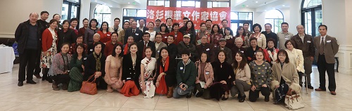 美国华人社团联合会荣誉主席张素久、美国华人联合总会会长李社潮、美国橙县华人联合会会长周晏羽、加州药剂师委员会主席罗辉等各界代表与作家协会近百名会员纷纷到场祝贺北奥连任会长。