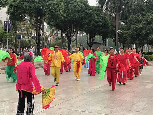 4月21日上午,记者在南宁市仙葫大道东方广场看到,30余名老年人正在扭秧歌,当大家整齐划一地向一个方向走来时,有一名走路都困难的老者一边舞动着扇子,一边迎面走向大队伍。当大队伍接近老人时,中间的两排人一边避让,一边踏着音乐节拍继续舞动,似乎已经习以为常。