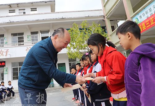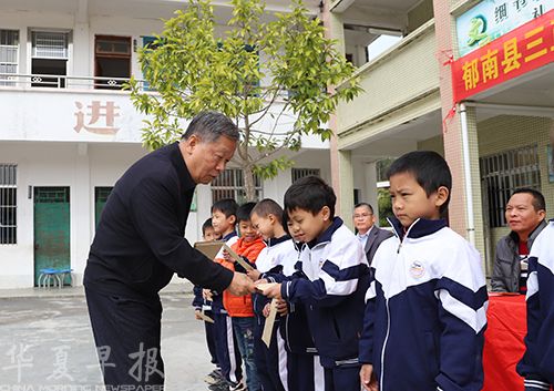 广东省教育基金会秘书长许怀升给孩子们发放三正奖教助学金。