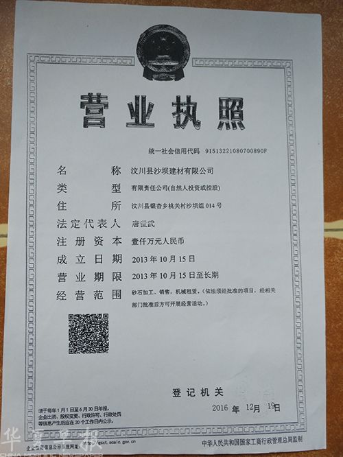 2013年初,40多家外地企业代表在汶川听取了“招商引资座谈会”,会上说得很好,“企业参与,变废为宝,变灾为利”,入驻企业的手续,由汶川相关政府部门所属公司帮助办理……我们在缴纳了200万保证金和相关办证费以及150多万资源费后,于20130年在当地工商部门办理了营业执照,经营范围:砂石加工,销售,机械租赁;营业期限为“2013年10月15日至长期”(见下图)。