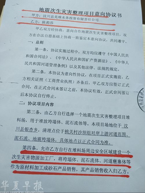 随后,我公司作为乙方,与代表当地政府的甲方、汶川县羌维水务投资有限责任公司签定了“地震次生灾害整理项目意向协议书”,明确了我公司对桃关村沙坝组对岸上游河道壅塞体范围、泥石流、地震垮塌体进行挖掘清理、转运、加工及销售要求。(本协议第四条明确规定:允许乙方自行在堆料场周边安全区域建设一个次生灾害物源加工厂,将垮塌体、泥石流、河道雍塞体等作为原材料加工成砂石产品销售,其产品销售收入归乙方。本协议第五条还规定:合作内容:由甲方负责该项目的前期工作,包括自协议签订之日起三个月内,协调办理相关手续,协调项目用地,协调电力供应,协调道路等并保证整理项目合法。详见下列两图)