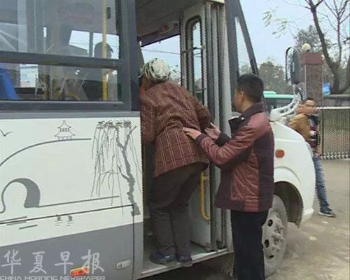 图为蒋桂云搀扶尿毒症患者上公交车。