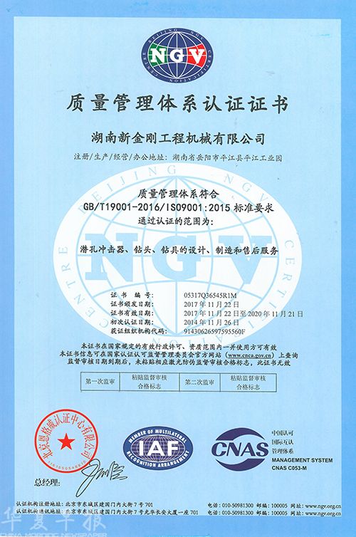 图为湖南新金刚工程机械有限公司获得的2017年质量管理体系认证证书。