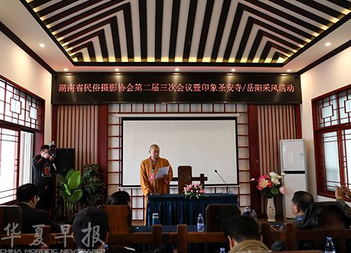 怀梵大和尚代表岳阳佛教界和圣安寺,对湖南省民俗摄影协会第二届三次会议的召开表示祝贺,其表示,佛教传入中国两千多年以来,与中国文化不断融合发展,千余年来,佛教理念在民俗文化中体现得淋漓尽致,佛教因民俗而大众化,民俗因佛教而哲理深。