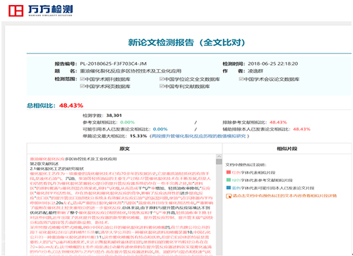 在一份2018年万方学术论文数据库的全文比对报告中显示,进行新论文检测报告的文字数为38301字(不含图表),显示总相似比高达48.43%,单篇论文最大相思比15.33%。