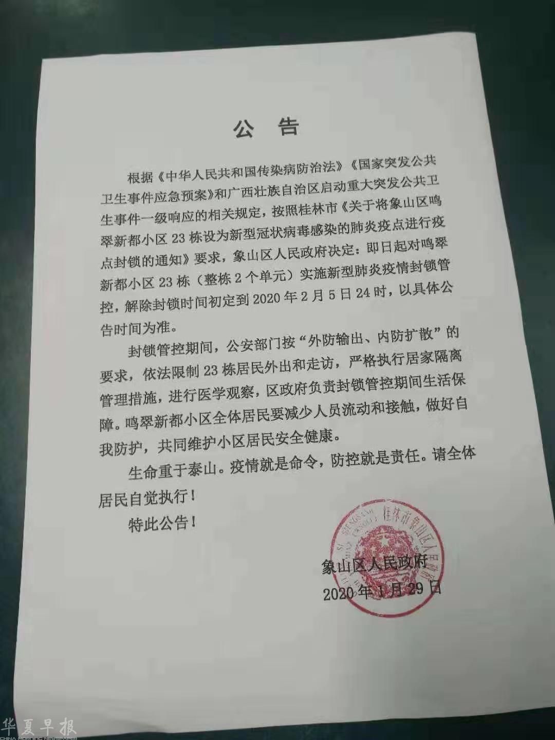 华夏早报-灯塔新闻记者今天(1月30日)从桂林市象山区人民政府证实了此事,1月29日晚上,象山区新型冠状病毒感染的肺炎防控指挥部召开会议,按照桂林市《关于将象山区鸣翠新都小区23栋设为新型冠状病毒感染的肺炎疫点进行疫点封锁的通知》要求,象山区人民政府决定,即日起将象山区鸣翠新都小区23栋(整栋2个单元)封锁管控,解除封锁管控时间初定于2月5日24时,以具体公告时间为准。