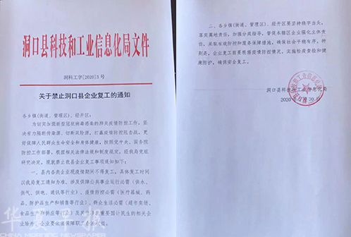 记者在洞口县科技和工业信息化局发布的洞科工字【2020】3号《关于禁止洞口县企业复工的通知》的文件中看到,为切实加强新型冠状病毒感染的肺炎疫情防控工作,坚决有力阻断传染源、切断风险源,打赢疫情防控阻击战,更好保障人民群众生命安全和身体健康,按照党中央、国务院防控工作部署,根据相关法律法规和制度规定,经我局党组研究决定:“县内各类企业现疫情期间不得复工,具体复工时间以我局复工通知为准。”