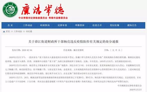 通报称,2020年1月27日、28日,桃源县新型冠状病毒感染的肺炎疫情防控指挥部已下发第8号、第9号令。杨亮拒不遵守疫情防控有关规定,且态度恶劣,在社会上造成严重不良影响。2月2日晚,桃源县纪委监委根据《中国共产党纪律处分条例》的相关规定,经研究决定给予杨亮党内严重警告处分。