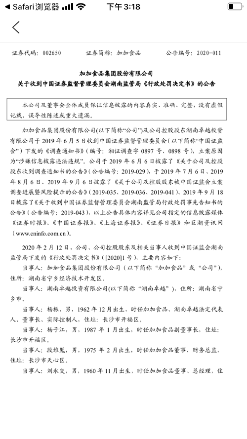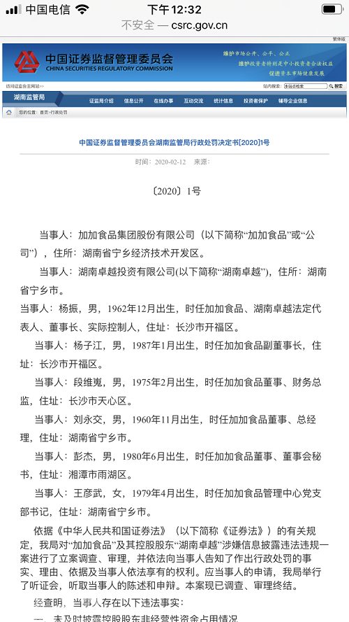 2月13日,加加食品对此也发布了相关公告,称公司于2020年2月12日收到了中国证监会湖南证监局下发的《行政处罚决定书》。