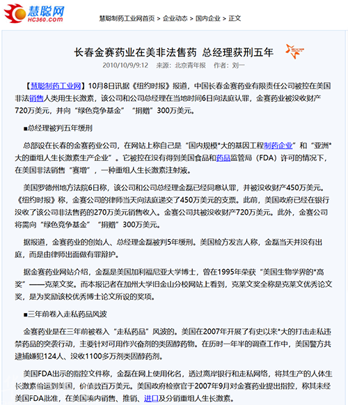 记者了解到,金磊被美国判刑后,曾有多家国内主流媒体对此进行了详细报道。北京青年报2010年的报道披露,金磊被控在没有得到美国食品和药品监管局许可的情况下,在美国非法销售一种名为“赛增”的重组人生长激素注射液。