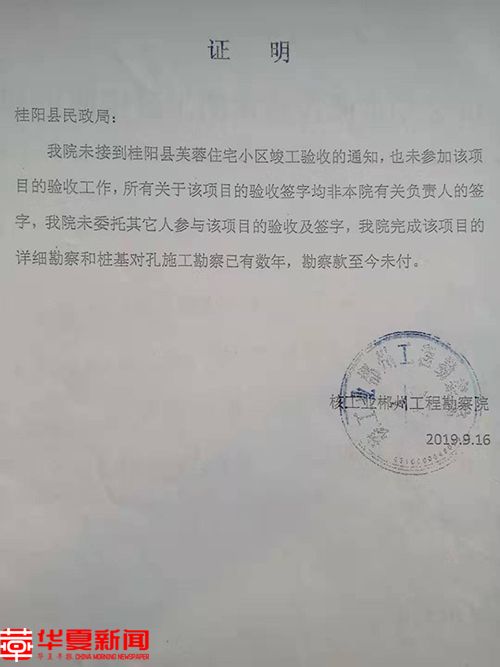 郴州工程勘察院出具未参与芙蓉花园小区验收报告证明。