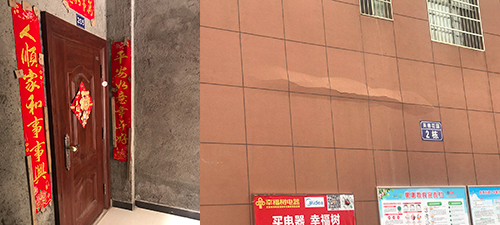 左图为未交房就有很多自购房的业主住进小区了,右图为小区外墙开裂,质量问题担忧。
