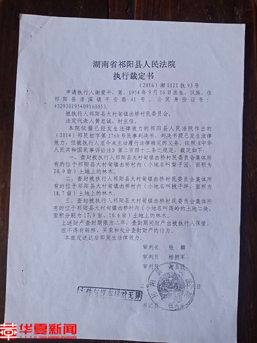 一直拖到2017年2月28日前,谢爱平称,在他的强烈要求下,祁阳县法院执行局才查封了氹桥村委会的四块林地及林木,面积共有68亩多(其中有退耕还林地)。2017年2月28日,祁阳县人民法院(2016)湘1121执93号执行裁定书证实了位于了氹桥村内包括梨子园、桃子坪、泻岭等四块土地上的林木被依法查封,查封期限为二年。查封期间不得有转移、买卖和处分查封财产的行为。