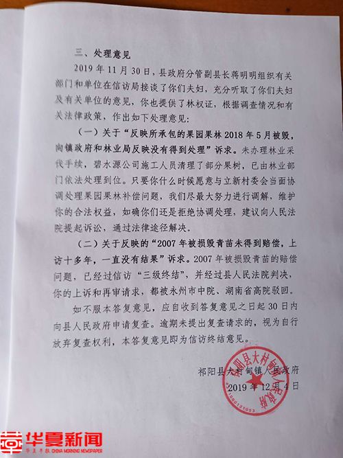 对此,谢爱平和杨桂英多次向立新村委会、大村甸镇政府和祁阳县表达青苗赔损款应该属于他们的诉求。2019年11月30日,祁阳县组织联席调处会后,祁阳县和大村甸镇有关领导却同意村里意见,要废除谢爱平林权证的法律效力,建议其与立新村协调或起诉。