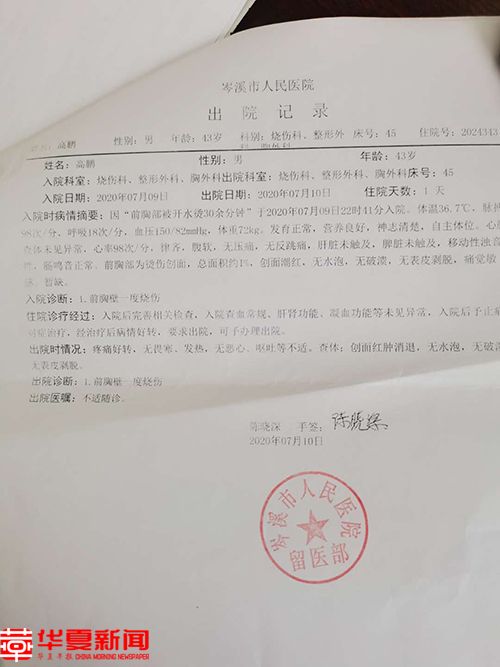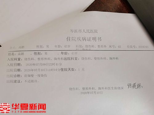 同时,冼宏伟将会议桌上几个茶杯中近100度的开水连续泼向高鹏,导致高鹏被烫伤,后被医生诊断“胸前壁一度烫伤”,华夏早报-灯塔新闻从医院开具的诊断证明中看到了这一结论。