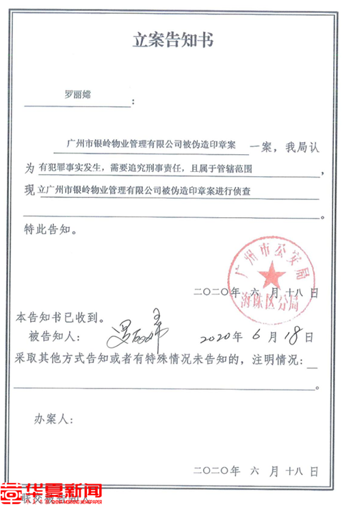 华夏早报-灯塔新闻了解到,对于破产管理人涉嫌伪造公章一事,当地公安机关已经立案侦查。广州市公安局海珠区分局2020年6月18日出具的立案告知书称,广州银岭物业管理有限公司被伪造印章一案,该局认为有犯罪事实发生,需要追究刑事责任,且属于该局管理范围,因此,海珠区分局对该案进行立案侦查。