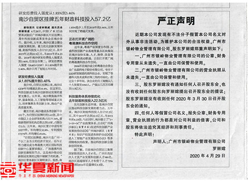 2020年4月29日,银岭公司另一股东罗丽嫦在当地报纸发布严正声明,声明称,银岭公司营业执照、公章和财务专用章从未遗失,一直由该公司保管和使用。同时,罗丽嫦在声明中还表示,她没有通过任何人召开股东会,也没有收到任何股东向她提出召开股东会的提议,她也没有收到任何2020年3月3日召开股东会的通知。