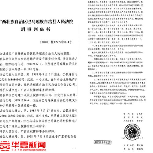 据市民提供的一份刑事判决书显示,2020年7月21日广西巴马瑶族自治县人民法院作出判决,宜州市金龙房地产开发有限责任公司法定代表人杨光隆因犯非法吸收公共存款罪,被判处有期徒刑五年六个月。同时,一审法院还判定其中22组集资参与人多得的款项必须追缴。