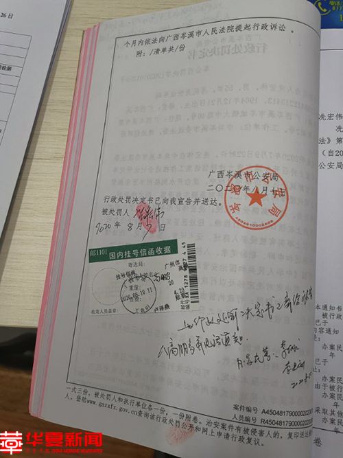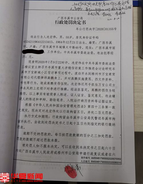 华夏早报-灯塔新闻了解到,2020年8月7日,广西岑溪市公安局向冼宏伟下达了一份行政处罚决定书。该决定书称,2020年7月9日22时许,冼宏伟在中共岑溪市委政法委三楼会议室主持召开岑溪市重大涉稳信访案工作推进会讨论研究岑溪市万宝新城小区信访事项过程中,泼白开水到梧州市万宝商贸有限公司代理律师高鹏身上,并对高鹏实施谩骂、扔文件资料、布包等行为,造成高鹏受伤住院;冼宏伟还用手抓住万宝公司方李永凤的上衣领口对李进行推搡。经法医鉴定,高鹏的损伤为轻微伤。