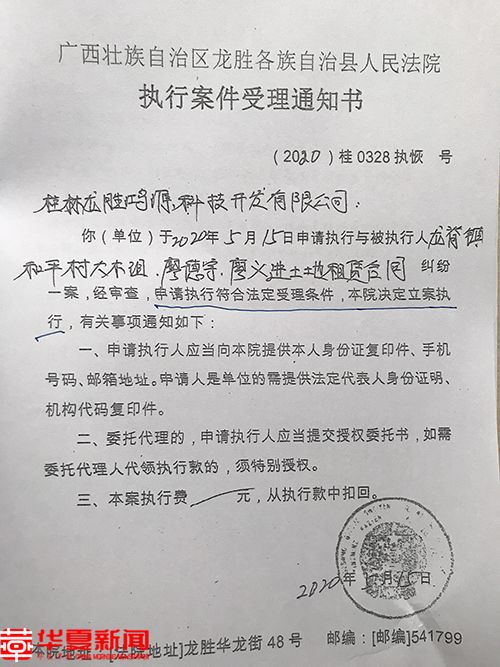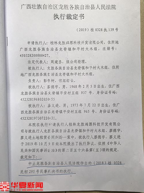 “你这个案件虽然经过了县、市两级法院判决,但领导也跟我说了这个涉及到方方面面的事情比较多,要跟县委县政府汇报,和政府协调,我们法院是受党领导的,是要政府协助助力的。”周建丞告诉华夏早报-灯塔新闻记者,龙胜县法院有关执行法官曾这样回复过他。
