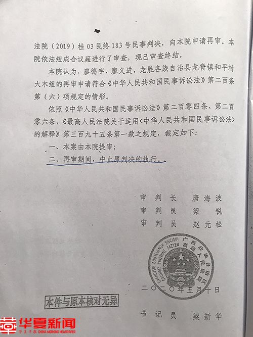 2020年5月10日,广西区高院裁定,再审期间,中止原判决的执行。