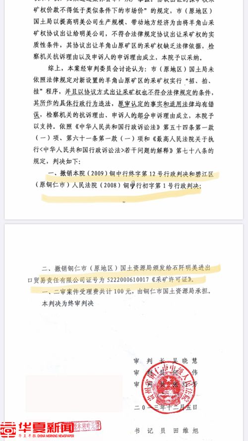 2013年12月,铜仁市中院再审判决撤销了明美公司的《采矿许可证》。