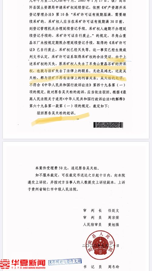 2020年10月1日,吴鸿尤之子吴天松收到贵州省思南县人民法院 (2020)黔0624行初49号行政裁定书,该裁定对吴天松今年3月提起的撤销被告石阡县自然资源局于2019年6月4日作出的《关于对<羊角山重晶石矿请求以协议方式完善采矿权人手续申请书>的答复》,撤销被告铜仁市人民政府于2019年8月14日作出的铜府行复决字【2019】34号《行政复议决定书》,判决被告铜仁市自然资源局40日内履行黔矿采证石矿字【99】第02号《采矿许可证》延续登记的许可审批职责)等三个诉讼请求,予以驳回。