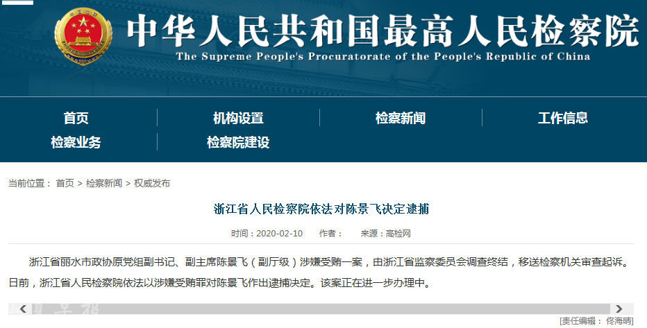日前,浙江省人民检察院依法以涉嫌受贿罪对陈景飞作出逮捕决定,该案正在进一步办理中。