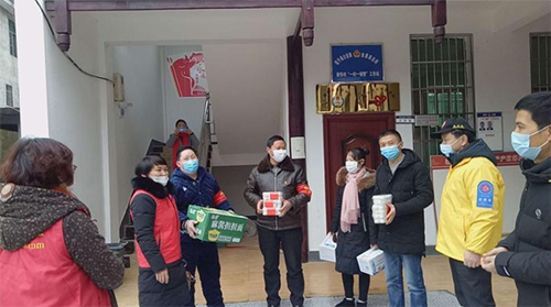 图为绥宁大邵公益志愿者联合会给乡镇抗疫人员送去消毒液、口罩等物资。