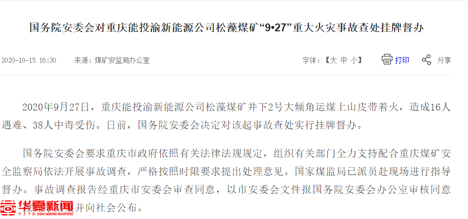 新京报快讯 据国家煤矿安监局官网消息,2020年9月27日,重庆能投渝新能源公司松藻煤矿井下2号大倾角运煤上山皮带着火,造成16人遇难、38人中毒受伤。日前,国务院安委会决定对该起事故查处实行挂牌督办。