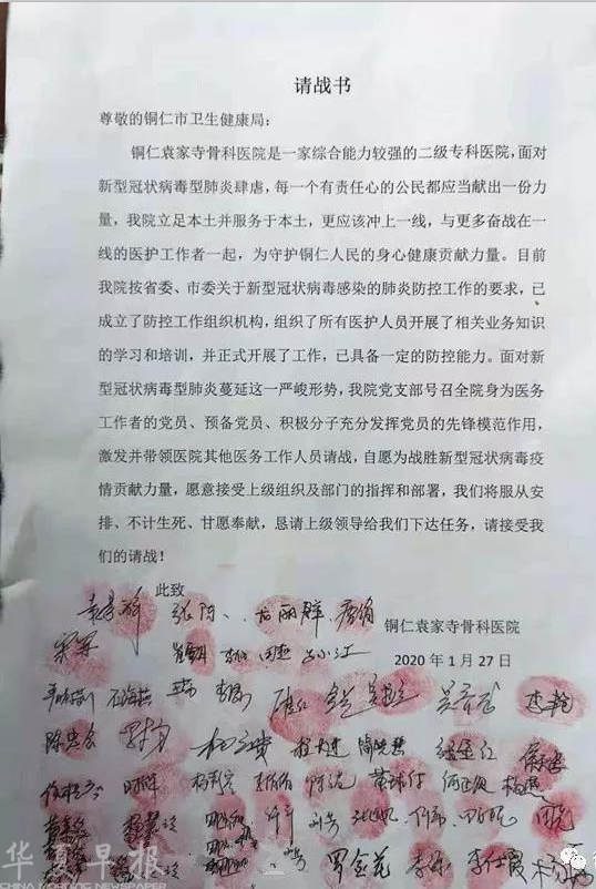 华夏早报贵州铜仁讯(记者 金松)近日,铜仁袁家寺骨科医院为全面应对新型冠状病毒感染的肺炎疫情防控工作,56名医务工作者纷纷按下红手印,请战疫情防控一线。
