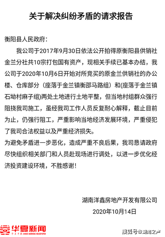 “我们通过合法竞拍获得的土地,却一直没法进场施工”近日,媒体收到衡阳洋鑫房地产开发有限公司的反映:2017年9月29日,在衡阳县神龙蒸阳大酒店“衡阳县金兰供销社改制资产专场拍卖会”现场。该公司以人民币2430万元价格竞得衡阳县金兰镇供销社改制整体资产,竞拍结果由湖南省衡阳县公证处现场公证。我们通过合法竞拍获得的土地,出让金交了几年了,却一直没法进场工作,只要一开工就被当地村民阻工,至今造成每天损失几万元。