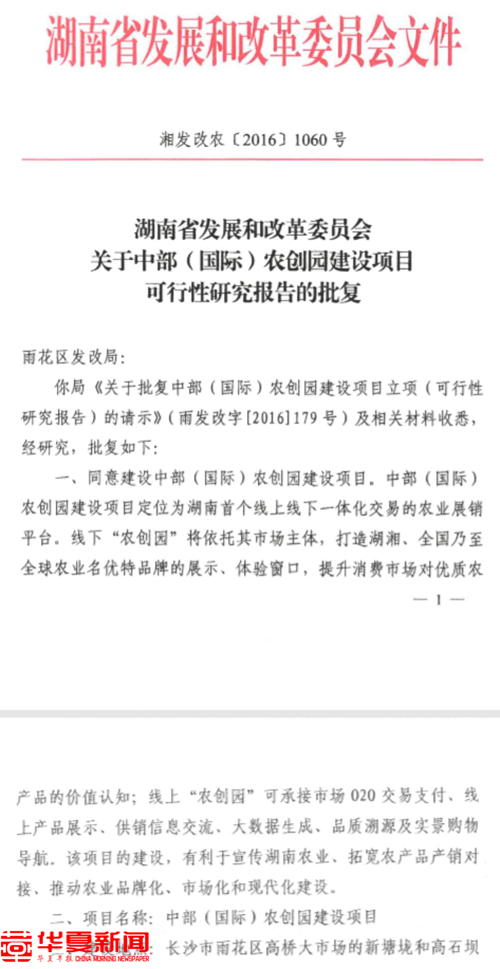 位于长沙市雨花区石坝路的中部国际农创园(现更名为:中部国际农博园),以下简称“农创园”。项目宣称园区占地600余亩,由188栋安置住宅门面组成,商用面积11万平方米,号称“永不谢幕的农博会”,本项目是经湖南省发展与改革委员会批复项目,红头文件:湘发改农【2016】1060号清楚地规定了本项目建设内容、建设期限、雨花区政府与主体方(湖南水木目商务管理有限公司)投资细节,两年项目建设期限过后至今,项目除了可见雨花区政府建设内容以外,批复上规定“水木目公司”建设的包含一个广场,两个配套,三条步行街,四大板块,线上线下提供交易平台等,一项也不见。