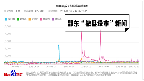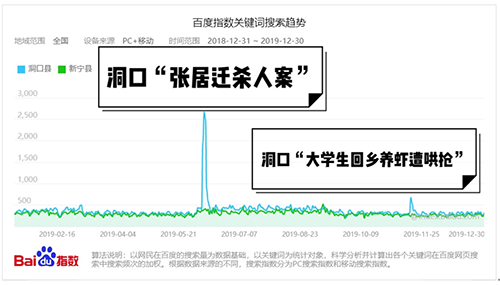 通过“百度指数”,大家就可以看出“洞口县”和“新宁县”2019年的新闻舆情表现: