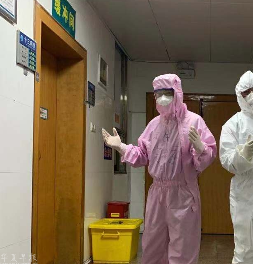 由于长时间穿着厚厚的防护服,朱晖的汗水常凝成水珠附着在眼镜上,模糊了双眼,脸颊的勒痕也分不清是眼罩还是口罩留下的。因为防护用品的短缺,他的防护服往往一穿就是四个小时,为了减少穿脱,他不敢多喝水,连厕所都不敢多上。