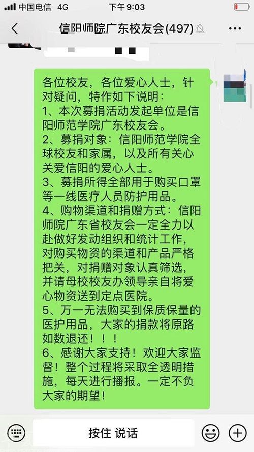 第二天,校友会秘书处正式在群里发出了爱心捐款倡议书,并且做出了承诺,如果找不到靠谱的渠道,买不到靠谱的物资,不能把物资捐赠到一线医护人员手里,捐款原数退还。