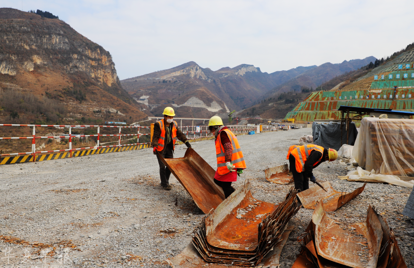 沿着施工便道,记者来到大坝坝顶。在1323米高程的坝顶,来自纳雍县厍东关乡陶营村的龙文勇夫妇、肖文华夫妇等5名工人带着口罩,正在为制作混凝土梭槽的铁皮除锈。他们告诉记者,家里的土地已全部种植玛瑙红樱桃,夹岩水利枢纽工程给他们带来大量的就业机会,在家门口就可以务工。