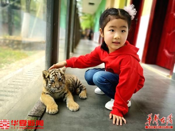 一位小女孩,兴奋又有些胆怯地与满月的虎宝宝亲密接触。