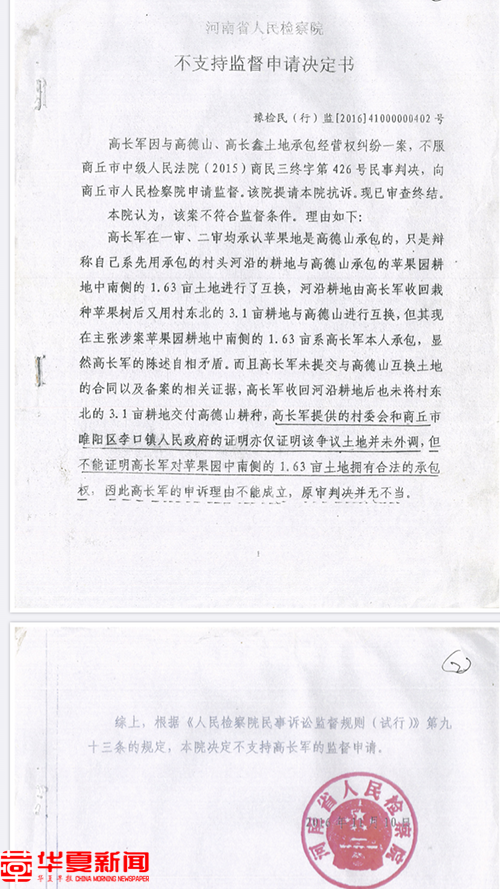 同时,高长军认为,商丘中院的主审法官否定、封杀新证据,枉法裁判。“法官在未调查核实的情况下,就认定村委会和镇政府签字盖章确认的证明(新证据)来源不明,内容不符合证据的客观真实性,这如何体现司法公正公平?”高长军说,没想到省级检察院的“决定”会如此草率和敷衍。