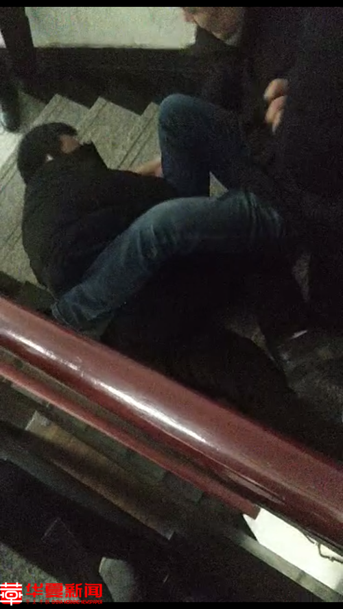 据现场视频显示,在楼梯处,代自军被一大个子男子按倒,两人被人拉开后,上到楼上楼道处又撕扯在一起,后被其他人再次分开。现场一位工作人员称,他当时看到两个人扭打在一起。在派出所配合警方询问时,其看到了两个人受伤的照片。