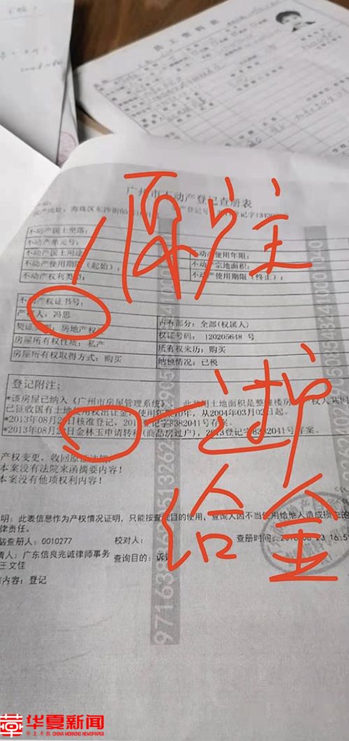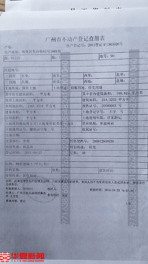 华夏早报-灯塔新闻从广东信良兆诚律师事务所2016年8月23日查询到的《广州市不动产登记查册表》(以下简称“查册表”)中看到,房产登记号为2011登记字1343026号的房产地址是:海珠区东沙街65号1601房,产权人是冯思,登记时间为2011年4月27日,建筑面积为254.3203平方米,房屋性质为商品房住宅。在该《查册表》的“登记附注”栏有注明“2013年8月22日金林玉申请转移(商品房过户),2013年8月26日核准登记”,并以“2013登记字8382041号存案”。
