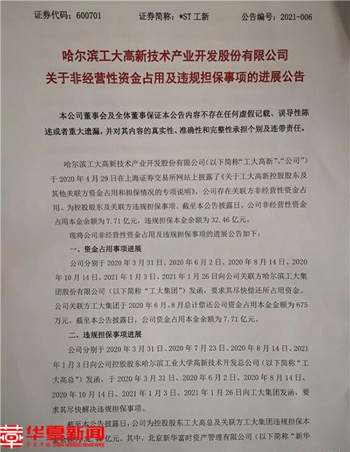 而关于哈工大承诺资产注入、工大高新违规担保及资金占用等问题,该工作人员表示,公司之前都有一些信息披露,上面的内容已经很清楚了,一切以公司的信息披露为准。但是华夏早报-灯塔新闻在查看了哈工大注入资产的公告后并没有发现注入资产必须以解决违规担保和资金占用为前提。