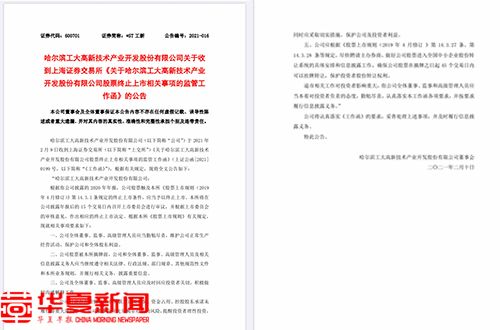 华夏早报-灯塔新闻在工大高新2021年2月10日发布的“哈尔滨工大高新技术产业开发股份有限公司关于收到上海证券交易所《关于哈尔滨工大高新技术产业开发股份有限公司股票终止上市相关事项的监管工作函》的公告”(简称“公告”)中看到,上海证券交易所指出工大高新“目前存在控股股东及关联方违规担保、资金占用、控股股东承诺未履行等重大风险事项。公司董事会应充分揭示存在的风险,提醒投资者理性投资,同时应采取切实措施,保护公司及投资者利益。”