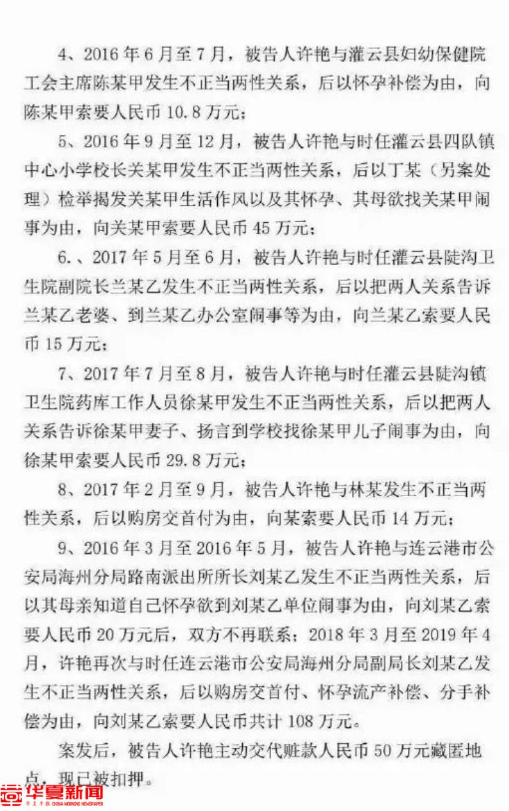 灌南县人民法院2020年12月29日的刑事判决书显示,2014年3月至2019年4月期间,许艳同时或者不间断的与多名公职人员发生不正当男女关系,后以自己家人找被害人闹事、买东西、怀孕、分手补偿等为由,先后敲诈9人共计人民币372.6万元。