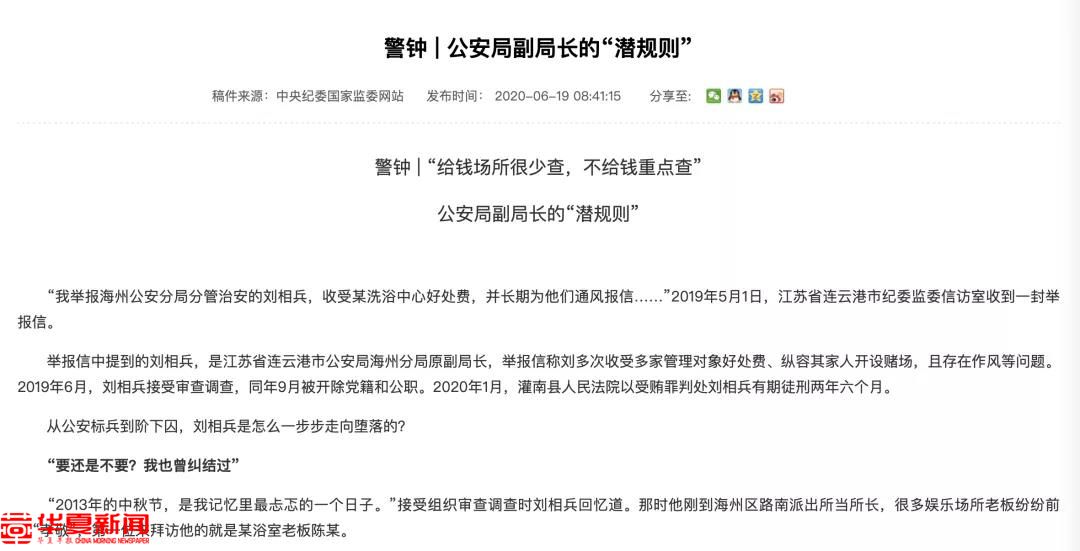 华夏早报-灯塔新闻查阅公开资料发现,2020年6月18日,中央纪委国家监委网站以《警钟 | “给钱场所很少查,不给钱重点查” 公安局副局长的“潜规则”》为题披露了连云港市公安局海州分局原副局长刘相兵违法犯罪一事。