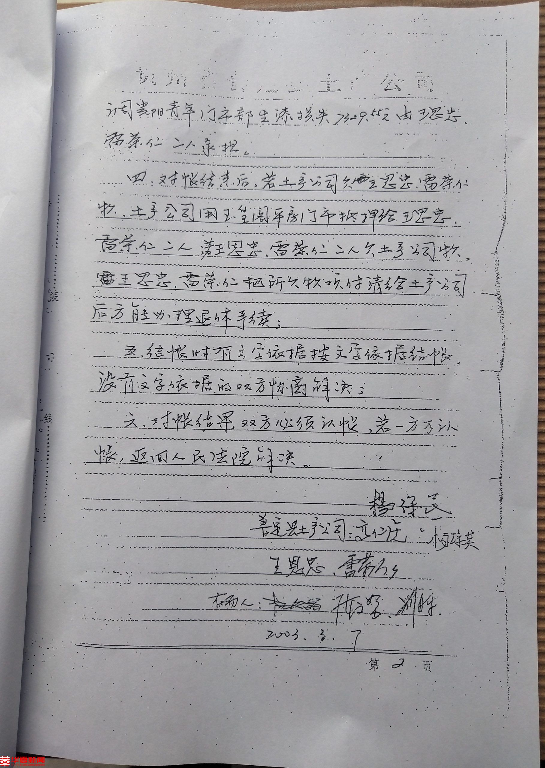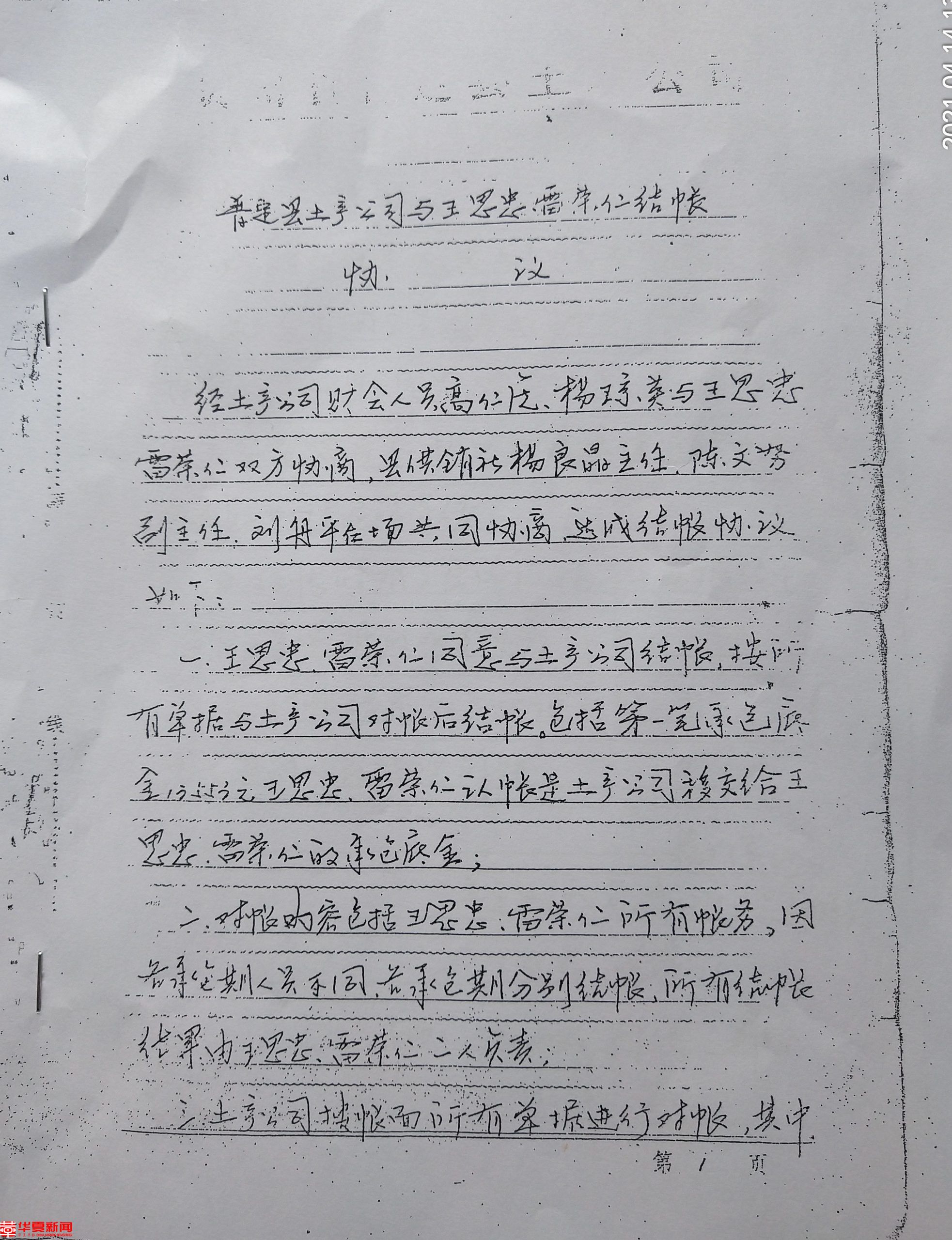 王恩忠向华夏早报-灯塔新闻提供了当年也就是2003年3月7日,普定县土产公司与他和雷荣仁签订的结账协议。该协议上载明“县供销社杨良晶主任、陈文努副主任,刘舟平在场共同协商,达成结账协议”。协议书后面也有刘舟平的签名。